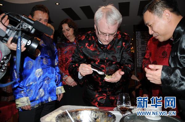 1月26日,在克羅地亞首都薩格勒布,克羅地亞總統約西波維奇(中)在中國駐克羅地亞大使館舉行的兔年迎新春招待會上學習包餃子,慶祝中國農歷兔年春節。新華社記者馬震攝