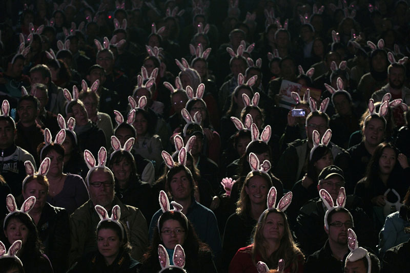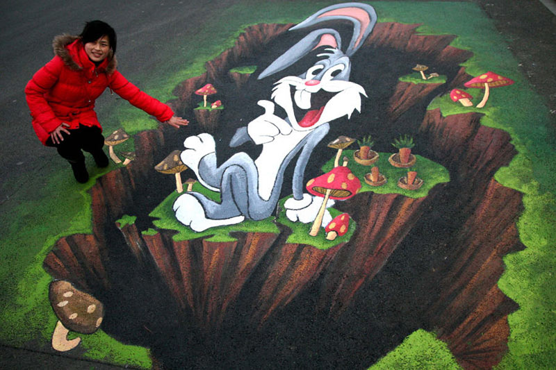 2011年1月,10余名南京藝術(shù)學(xué)院學(xué)生在南京玄武湖公園的地面上創(chuàng)作了許多以兔子為主題的三維立體畫(huà),迎接兔年春節(jié)的到來(lái)。1月30日,游人在南京玄武湖公園一幅三維立體畫(huà)旁拍照留念。