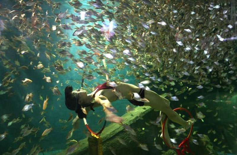 2011年2月3日,南通,南通海底世界演員首次為觀眾獻(xiàn)上“紅鰭銀鯽群游共舞”表演賀新春。