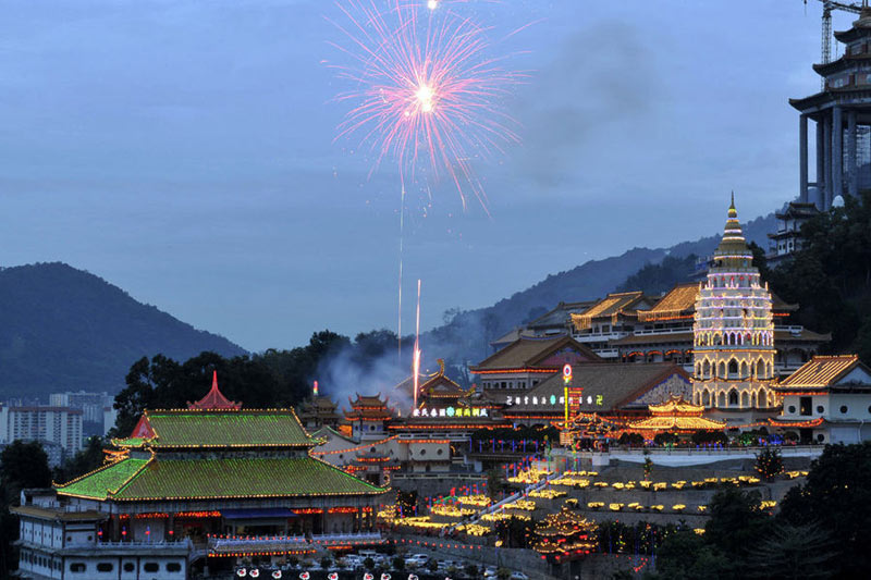2011年1月29日,馬來(lái)西亞檳城極樂(lè)寺燃放煙花迎春節(jié)。