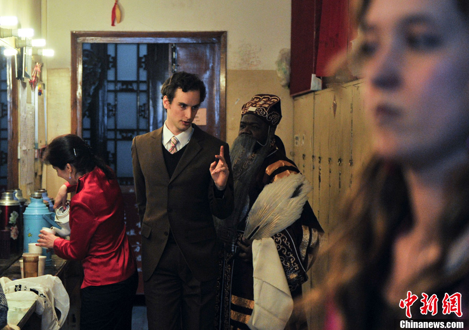 2月13日,首屆外國人鬧元宵中華才藝大聯(lián)歡在北京老舍茶館舉行,外國演員們?cè)诤笈_(tái)準(zhǔn)備節(jié)目。中新社記者 廖攀 攝