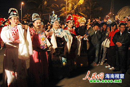 在海瑞故居的兩棵榕樹下,市民許愿祈福活動更是熱鬧,市民紛紛把新年愿望寫在卡片上,系上紅繩綁在榕樹下,祈求新的一年平安吉祥、順順利利。此外,當晚的紅城湖廟會也人潮涌動、熱鬧非凡,燈展、游園、卡拉OK、木偶戲、傳統小吃、瓊劇票友演唱會等讓市民們興致濃濃。