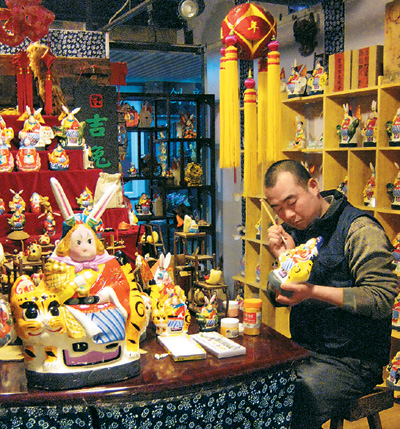 在北京南三環附近的吉兔坊工作室里,“80后”的兔爺制作名家胡鵬飛正在一絲不茍地為一只大號兔爺“開臉兒”,在老舍茶館參展的兔爺大部分都是出自他的手。胡鵬飛的泥塑手藝是祖傳的,泥虎是他的拿手絕活。2000年胡鵬飛開始接觸兔爺,當他的手輕輕觸摸到兔爺可愛的耳朵的時候,他便深深愛上了這種可愛的泥偶。由于年輕,創新的思維時時在他心頭涌動,所以傳統的兔爺形象到了他手里開始起了奇妙的變化。