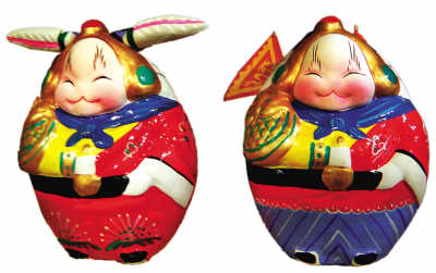 在胡鵬飛的工作室里,記者看到了各種各樣的新式兔爺。這些兔爺的最大特點就是微笑,傳統兔爺的三拌嘴呈三角形向下,顯得嚴肅威武,有的甚至比較猙獰;胡鵬飛的筆畫到三瓣嘴的末梢的時候向上一挑,便挑出了一個笑容可掬、親切喜慶的新版兔爺!用王連海的話說,這樣的兔爺正好象征著團圓和氣、幸福美滿,也正符合我們這個時代的精神。