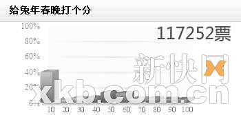 在某娛樂門戶網站“給兔年春晚打個分”這一投票中,僅僅只給最低分10分的觀眾竟然達到39.8%之多,次級較多的投票集中在50分和60分,50分占13.1%,60分占12.1%,不滿意的聲音為絕大多數,不過仍有4.4%,共計5111位網友表示可以給到100分,雖然在總數里少得可憐,但也不失為一份意見。