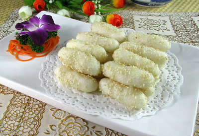 元宵節的食品出現于唐宋時的有油錘!吧显澥辰瑰N最盛且久!睋未摹短綇V記》記載:油熱后從銀盒中取出錘子餡。用物在和好的軟面中團之。將團得錘子放到鍋中煮熟。用銀策撈出,放到新打的井水中浸透。再將油錘子投入油鍋中,炸三五沸取出。吃起來“其味脆美,不可言狀”。原來唐宋時的油錘就是后世所言的炸元宵。油錘經過一千多年的發展,其制法與品種已頗具地方特色,僅廣東一省,便有番屬的“通心煎堆”、東莞的“碌堆”、九江的“煎堆”等等,真可謂唐宋食風今猶在。