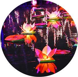 趵突泉的花燈早早地掛了起來,白天賞燈目不暇給、形態各異。待夜幕降臨、華燈初上,更是一番紅光綠影、恍若步入夢幻之境。徜徉在園內,水面、路旁、廊內處處都是燈與燈的光影。遠遠望去,那水中仿真的組燈作品“魅力世博”和“畫舫環城”栩栩如生,特別是那水中的倒影格外迷人。還有那雙耳豎立、齜牙咧嘴的“群兔鬧春”生動可愛,就連那花瓶中綻放的“梅花”也仿佛散發著淡淡的幽香……一盞盞瑩亮的荷燈在水面游弋,看得人心里好安靜,禁不住悄悄許下自己的心愿。