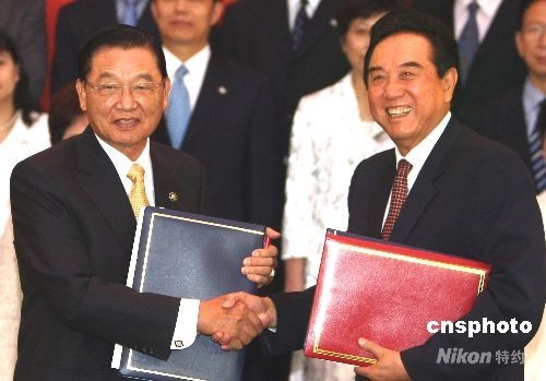 6月13日上午,海峽兩岸關系協會會長陳云林(右)與臺灣海峽交流基金會董事長江丙坤在北京釣魚臺五號樓簽署并交換“兩岸周末包機”和“大陸居民赴臺旅游”協議文本。 中新社發 任晨鳴 攝