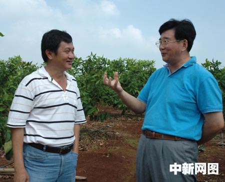 2006年10月,海南省臺辦徐剛主任(右)到定安縣臺資農場金德豐公司察看蓮霧長勢,左為臺商黃益豐。(圖片來源:中國新聞網)
