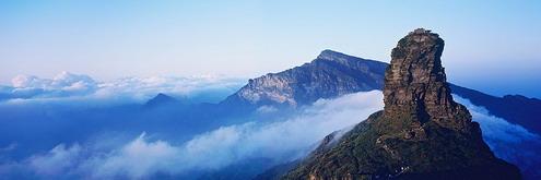 梵凈山坐落貴州銅仁地區的江口、印江、松桃三縣結合部,海拔不是太高(相對西部山峰而言),為2572米,是武陵山脈的主峰,也是貴州的第一高山。山峰上有兩個金頂,北面的為老金頂,南面的為新金頂(后人為了便于稱謂山上兩個主峰,故此),本主題反映的是新金頂。