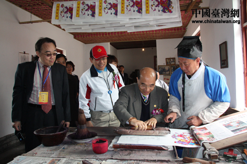 臺灣海峽兩岸教育促進協會理事長李超群感受版畫藝術。(中國臺灣網 楊永青 攝)