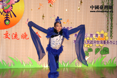 晚會(huì)由濰坊市教育局、濰坊市臺(tái)辦主辦,能容納300人的寒亭區(qū)外國(guó)語(yǔ)學(xué)校階梯教室座無(wú)虛席。寒亭區(qū)外國(guó)語(yǔ)學(xué)校的舞蹈《開(kāi)門(mén)紅》拉開(kāi)了晚會(huì)的序幕,他們身穿紅色小褂,舞蹈熱情有勁,引來(lái)臺(tái)灣學(xué)生陣陣感嘆“太可愛(ài)了”。
