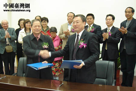 開幕式后,山東濰坊市第一中學(xué)和臺(tái)北縣南山中學(xué)的領(lǐng)導(dǎo)就校際交流簽約