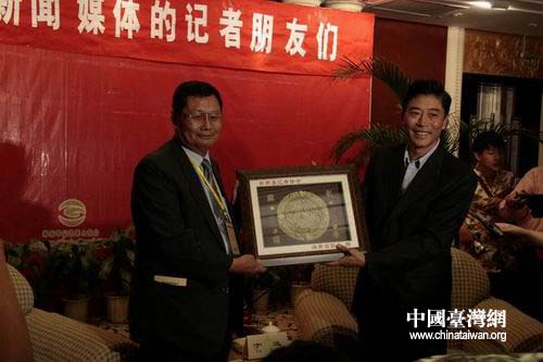 中國臺灣網11月29日海口消息 “兩岸媒體海南行”采訪活動28日在海口正式啟動。兩岸共有40余名記者參加了此次活動,其中臺灣12家媒體的24名記者全部來自臺灣南部。圖為海南省委副書記于迅(右)與臺灣媒體記者團長黃瑩輝互贈禮品.(李杰)