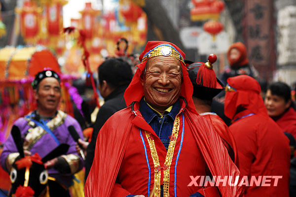 2月14日,在淄博周村古商城內,一名參加民俗表演的演員露出笑容。當日是農歷大年初一,山東淄博周村古商城推出賞花燈、劃旱船、猜謎語等系列民俗活動,讓游客體驗過民俗大年的樂趣。新華社發(董乃德 攝)