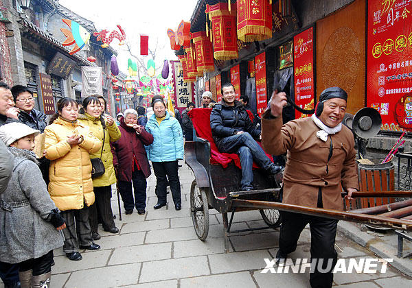2月14日,游客在淄博周村古商城民俗活動上試乘人力車。當日是農歷大年初一,山東淄博周村古商城推出賞花燈、劃旱船、猜謎語等系列民俗活動,讓游客體驗過民俗大年的樂趣。新華社發(董乃德 攝)
