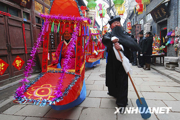 2月14日在淄博周村古商城拍攝的“劃旱船”民俗表演。當日是農歷大年初一,山東淄博周村古商城推出賞花燈、劃旱船、猜謎語等系列民俗活動,讓游客體驗過民俗大年的樂趣。新華社發(董乃德 攝)