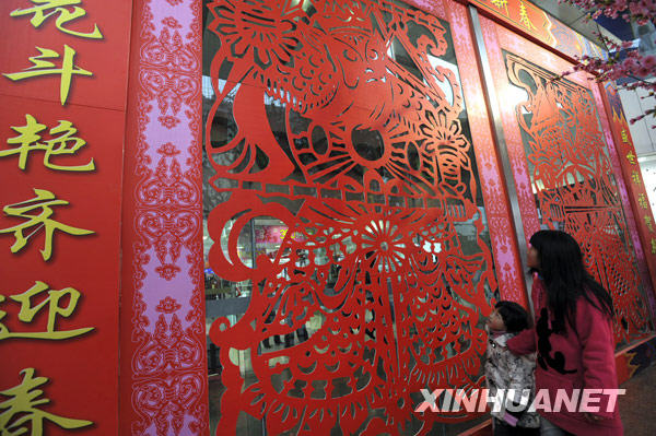 2月1日,兩個(gè)孩子在合肥市步行街觀看商場櫥窗上粘貼的巨大窗花。