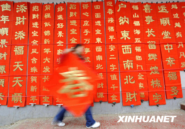 2月1日,在湖北省宜昌市街頭,一名市民從掛滿春聯(lián)的墻邊走過。新華社發(fā)(曹禮達(dá) 攝)