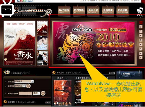 臺灣最大生活類網站watchnow在數日前就在首頁顯著位置跟蹤報道央視春節聯歡晚會,并設置了直播專區,對央視春晚進行全程直播,供臺灣民眾觀看。(陳佳慧)