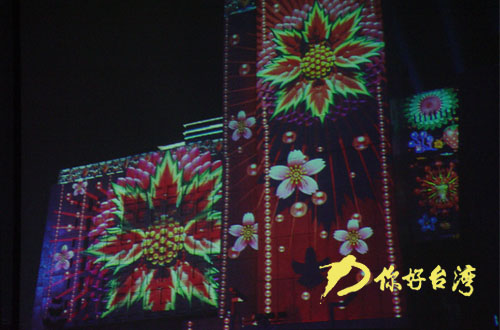 以上三幅圖片為本網記者在記者會現場,從屏幕上拍下的畫面——燈光投影下的臺北市政府大樓墻面(你好臺灣網 葉進華 王小珍 攝)