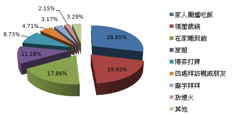 調查顯示,其次是“領壓歲錢”19.95%,第三則是“在家睡到飽”17.86%,“旅游”以11.28%占第四,“博奕打牌”居第五8.73%。農歷年多數受訪者還是有著“團圓”的傳統觀念,期待與家人團聚吃飯聊天,小朋友當然最開心的就是領壓歲錢,可以去買喜歡的東西。