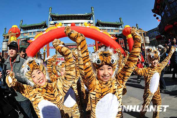 1月31日,一隊由小朋友扮演的“小老虎”在前門步行街進行踩街表演。當日,2010年北京春節系列文化活動正式啟動。本次活動持續1個多月,將開展160多項文化活動和萬余場群眾性演出,讓北京市民在春節前后享受文化盛宴新華社記者羅曉光攝