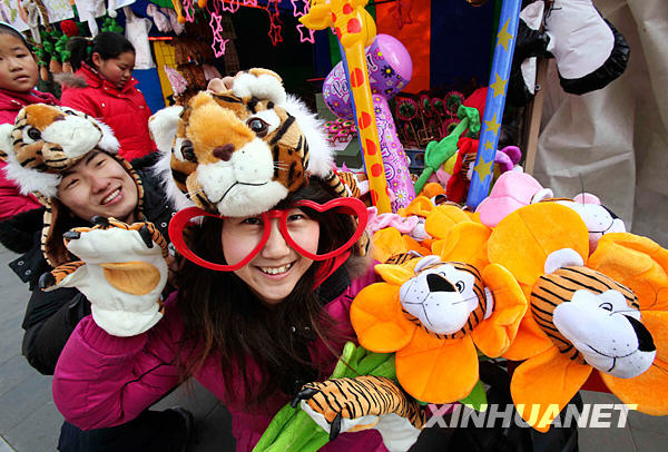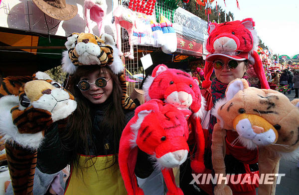 2月13日,兩位年輕人在北京地壇公園展示“虎帽”。農(nóng)歷虎年即將來(lái)臨,各種虎主題玩具成為春節(jié)廟會(huì)上的寵兒。新華社發(fā)(陳曉根 攝)