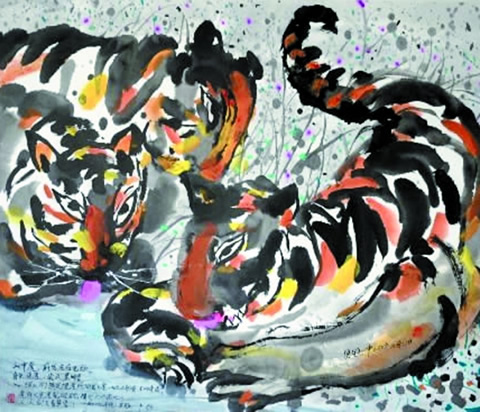 新年伊始,吳冠中展示了他的新作——一群斑斕的賀年大虎,畫上題詞曰:“山中虎,前后左右無敵。自在,逍遙,威風顯赫。入深山,幻想發現老死洞窟之虎,山大王自傾(倒),無此奇緣!虎年又至,虎視眈眈,橫行大江南北,人人刮目看尊容!”