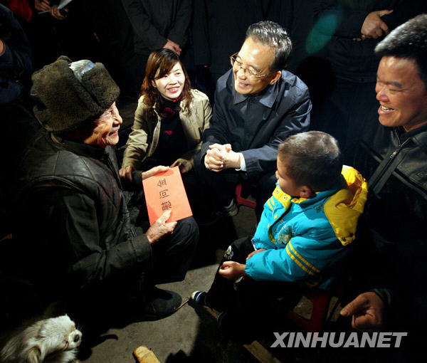 2月12日至13日,中共中央政治局常委、國務(wù)院總理溫家寶來到廣西河池市東蘭縣、巴馬瑤族自治縣,看望慰問受災(zāi)群眾,指導(dǎo)抗旱救災(zāi)工作。這是2月13日,溫家寶在東蘭縣東蘭鎮(zhèn)田洞村看望群眾時(shí)給95歲的孫繼凡老人拜年。新華社記者 姚大偉 攝