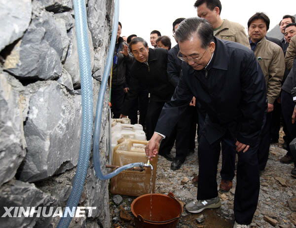 在村民黃輝家,溫家寶和他75歲的母親聊起家常。總理請(qǐng)老人放心,政府一定會(huì)讓大家有水喝、有水用。他對(duì)當(dāng)?shù)刎?fù)責(zé)人說,春節(jié)到了,春耕也快到了,旱情形勢不容樂觀,抗旱工作不可松懈。要把水利設(shè)施建設(shè)擺在農(nóng)村建設(shè)的第一位,不僅要保證人畜飲水,還要滿足農(nóng)業(yè)生產(chǎn)需要。要大力興建水庫,修建引水工程、雨水集流工程,包括家庭水窖、水柜、水管等,把水送到家家戶戶,確保群眾用上干凈、衛(wèi)生、安全的水,同時(shí)也要注意節(jié)約用水。
