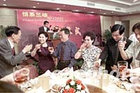 “情系三峽--兩岸文化聯(lián)誼行”活動(dòng)01年7月16日晚在重慶正式拉開帷幕,來自海峽兩岸的200余位文化界人士將沿長(zhǎng)江三峽進(jìn)行為期7天的中華文化交流與研討。圖為文化部副部長(zhǎng)孟曉駟(左2)、中國(guó)作家協(xié)會(huì)副主席王蒙(左3)與臺(tái)灣代表共同舉杯慶賀。中新社記者 毛建軍 攝