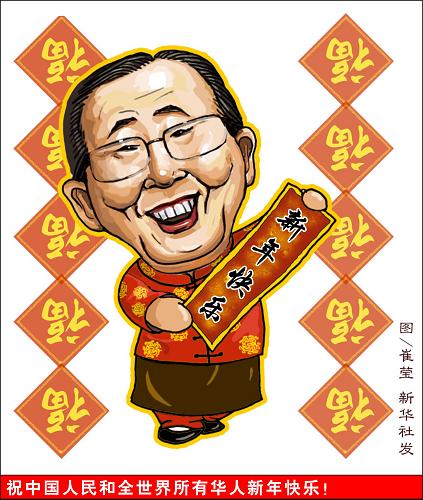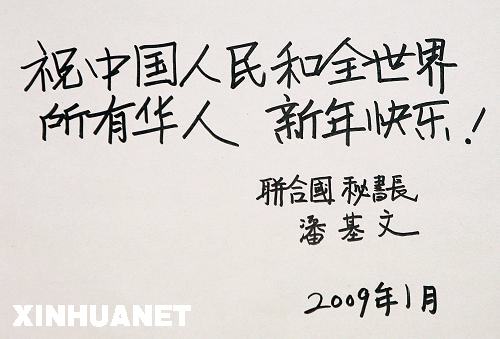 2009年中國農歷新年即將到來之際,聯合國秘書長潘基文1月23日通過新華社(網)發表祝詞,祝愿中國人民和全球華人新年快樂。 潘基文親筆用漢字書寫了賀詞:“祝中國人民和全世界所有華人新年快樂!”新華社發