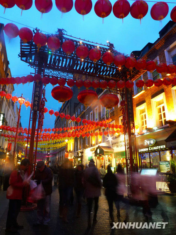2月7日,游客走在掛滿串串火紅燈籠的英國倫敦唐人街。 隨著中國傳統節日春節的臨近,熱鬧的倫敦唐人街掛起各式燈籠,營造了歡樂祥和的節日氛圍。 新華社發(齊家攝)