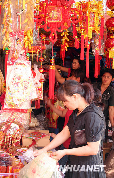 2月13日,人們在緬甸仰光唐人街購物。隨著農歷新年的來臨,仰光街頭充滿了喜慶的氣氛。新華社發(陳美華攝)