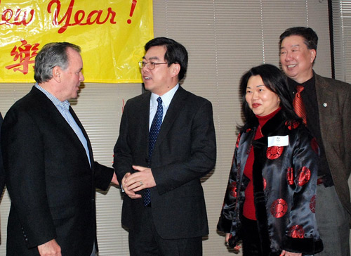 黃屏總領事(左二)與戴利市長(左一)在慶祝會上親切交談。(《芝加哥華語論壇》 張大衛(wèi)攝)