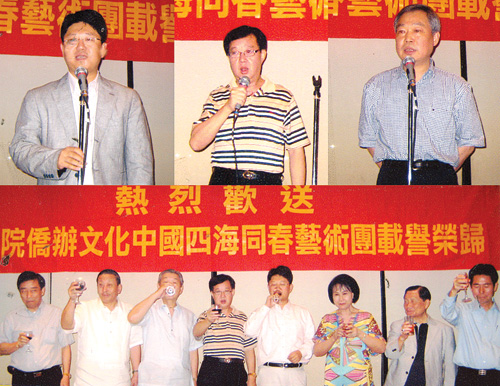 中國駐菲大使館白天代辦,王軍領事等使館領導,藝術團團長熊昌良,藝術團全體演員和菲華各界聯合會名譽主席,常務委員、委員等出席了歡送宴會。中國駐菲大使館白天政務參贊、藝術團團長熊昌良,菲華各界聯合會主席戴宏達先后致詞。該會委員們與藝術家們歡聚一堂,大家觸光交錯,氣氛熱烈。