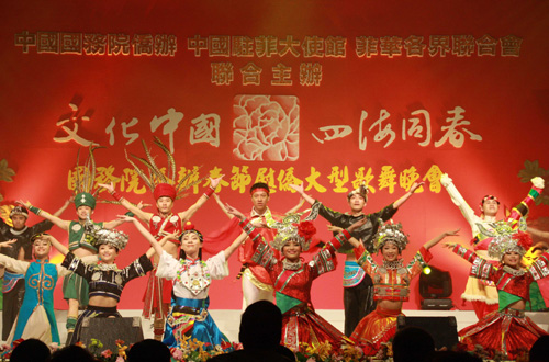 中新網2月21日電 2月19日晚,由中國國務院僑辦、中國駐菲律賓大使館和菲華各界聯合會聯合舉辦的“文化中國·四海同春”大型歌舞晚會,在菲律賓首都馬尼拉的國際會展中心舉行。來自中國貴州、四川兩省的40余名藝術家為觀眾們獻上了一場匯集中國各地少數民族特色和地方民俗的精彩歌舞表演。圖為熱鬧喜慶的開場舞《花開中華大家園》。
