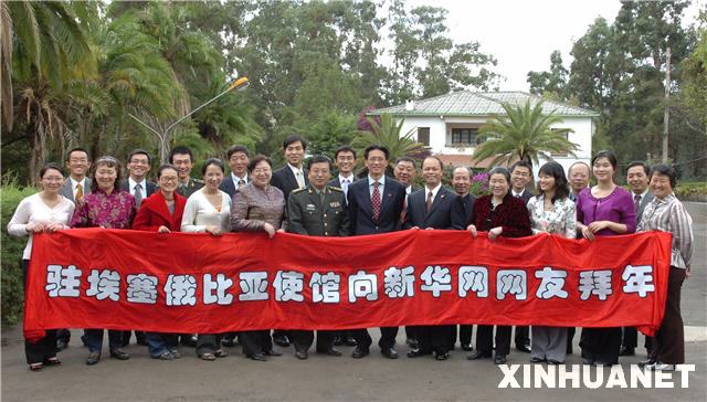 中國駐守埃塞俄比亞使館恭祝新華網網友虎年大吉(中間為中國駐埃塞俄比亞使館大使顧小杰)新華社 梁尚剛攝