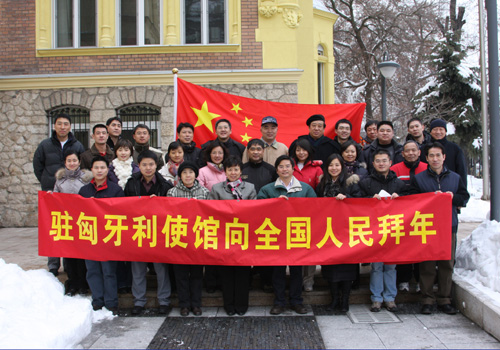中國駐匈牙利大使高建(前排右五)和大使館全體工作人員通過新華網向全國人民拜年!(新華社記者楊永前攝)