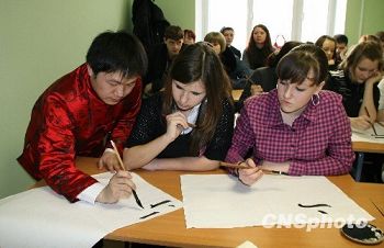 2月24日,俄羅斯“漢語年”“中國文化周”在俄羅斯阿穆爾州遠東國立農業大學國際中心開幕。開幕式上,俄羅斯布拉戈維申斯克國立師范大學孔子學院書法教師王健霖舉辦了題為《印象中國》的攝影展,向俄羅斯學生展示中國的風土人情,還向俄羅斯學生傳授了中國書法知識,加深了俄羅斯學生對中國的了解。據了解,俄羅斯遠東地區學習漢語、漢文化的學生越來越多,掀起了新的學習漢文化熱潮。(中新社/邱齊龍 攝)