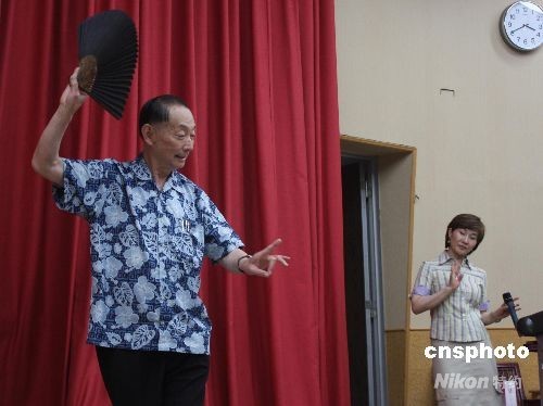 資料圖:京劇大師梅蘭芳之子梅葆玖(左)第三次訪問臺灣,六月二十一日應邀在臺北科技大學演講時,應京劇戲迷要求表演《霸王別姬》片斷,其臺灣女弟子魏海敏(右)作陪并在一旁認真學習揣摩。中新社發耿軍 攝