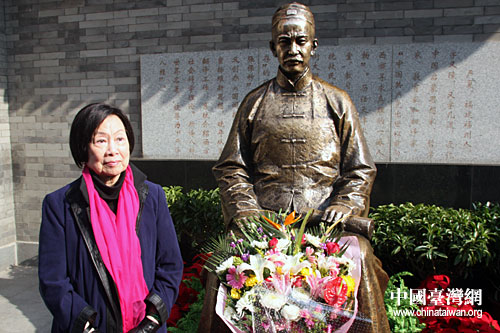 辜嚴倬云為其祖父嚴復的銅像雕塑獻上鮮花(中國臺灣網 董潔 攝)