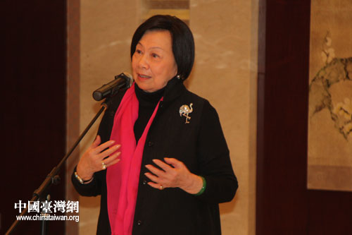 出席海峽兩岸京劇藝術(shù)論壇的臺灣海基會前董事長辜振甫遺孀、臺灣中華婦聯(lián)總會主任委員辜嚴倬云,在兩岸京劇票友聯(lián)誼活動現(xiàn)場演唱《鎖麟囊》選段春秋亭。(中國臺灣網(wǎng) 董潔 攝)