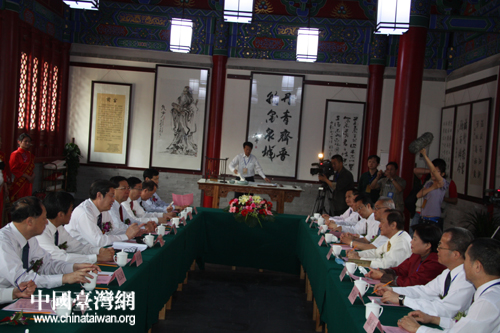 第二屆海峽兩岸經典文化推廣會演15日上午在濟南府學文廟開幕。儀式開始前,濟南市長張建國會見了臺灣新黨主席郁慕明、海協會副會長張銘清等出席活動的兩岸嘉賓。(中國臺灣網 楊麗 攝)