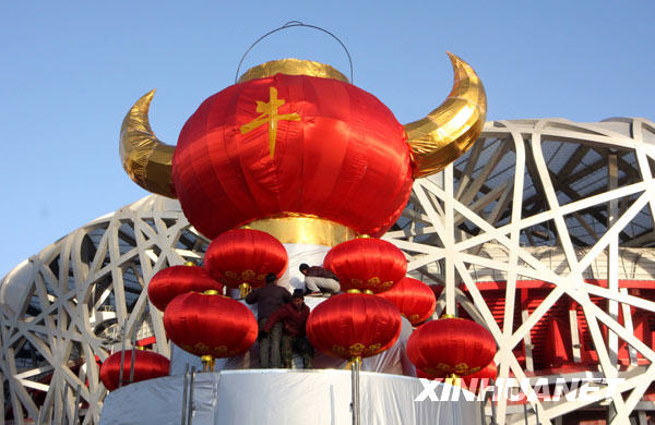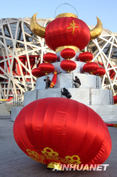 1月24日,工人們?cè)凇傍B巢”前安裝牛年主題燈籠。新華社發(fā)(吳長(zhǎng)青 攝)
