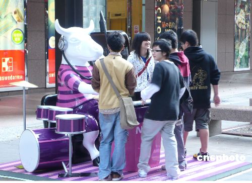 圖為時尚的鼓手造型的牛塑像受到青少年的喜愛。