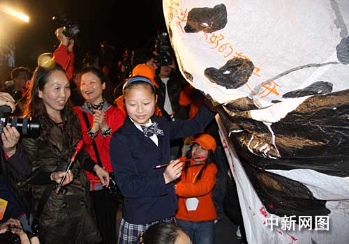 圖為應邀隨團來臺的十三歲四川“抗震救災英雄少年”陽玉潔(中)正準備在四川成都東羽蜀都燈會提供的印有大熊貓團團圓圓圖案的主燈上題字祈愿。記者 陳立宇 攝