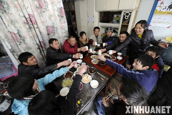 1月24日,在映秀鎮臨時板房里,中灘堡村村民鄧漢明一家人和親戚在一起吃團圓飯。四川汶川縣映秀鎮是汶川大地震重災區之一。在社會各界的幫助下,全鎮人民積極生產自救,目前各族群眾在積極準備,喜迎農歷新年。新華社記者王建華攝