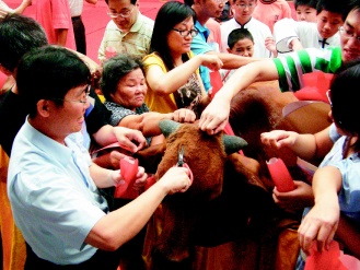 臺南縣祭孔最后拔智慧毛時,民眾一擁而上,有名30多歲男子竟掏出小剪刀在牛頭上連剪3、4次,將一撮撮牛毛放入口袋。有家長看見急著說:“智慧毛是要用拔的,孔夫子也不會認同用剪的。”另名家長說,如果不制止這種行為,以后他要將整條牛扛回家,也有人說明年帶電動刮胡刀來。(高大林) |